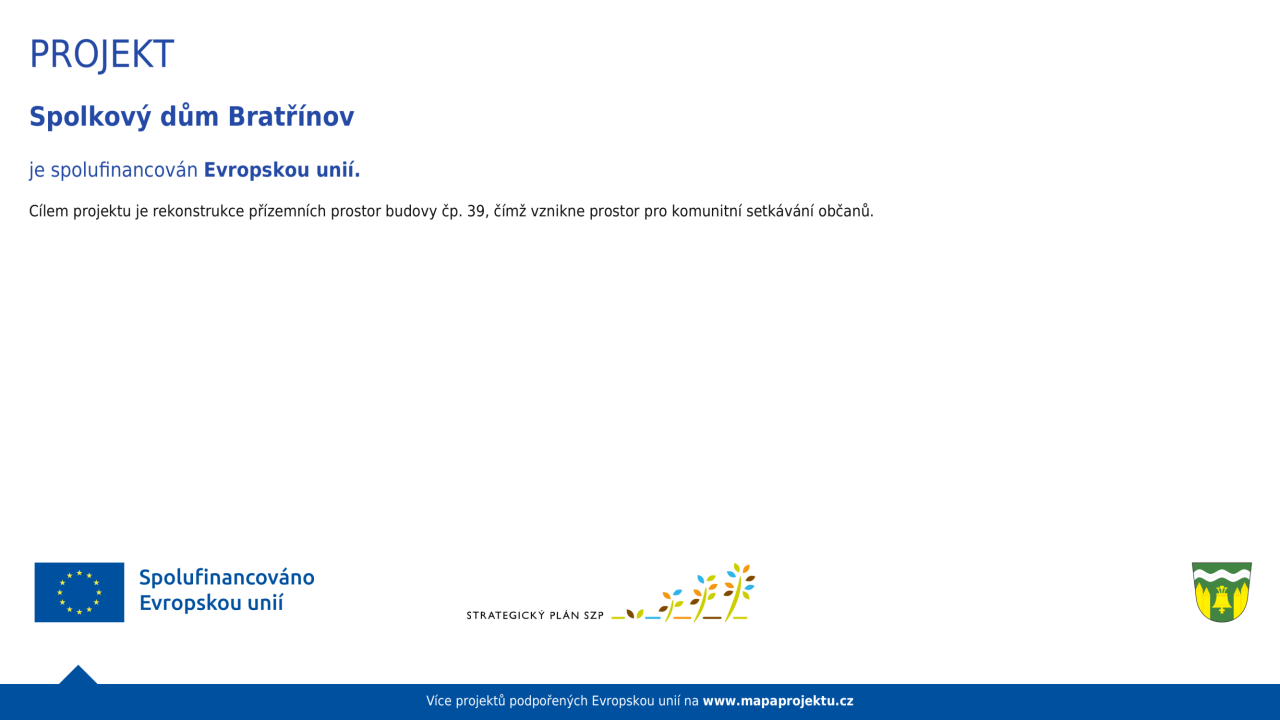 Obec Bratřínov s finanční podporou Evropské unie rekonstruovala přízemní prostory domu čp. 39, kde vznikla společenská místnost se sociálním zázemím. Rekonstrukcí byly vytvořeny prostory pro komunitní setkávání občanů. Tím se podpořilo společenské a kulturní dění v obci. Setkávání hasičů, sportovních oddílů, mládeže a dětí s rodiči při různých aktivitách přispěje k udržení sociálních kontaktů mezi obyvateli.